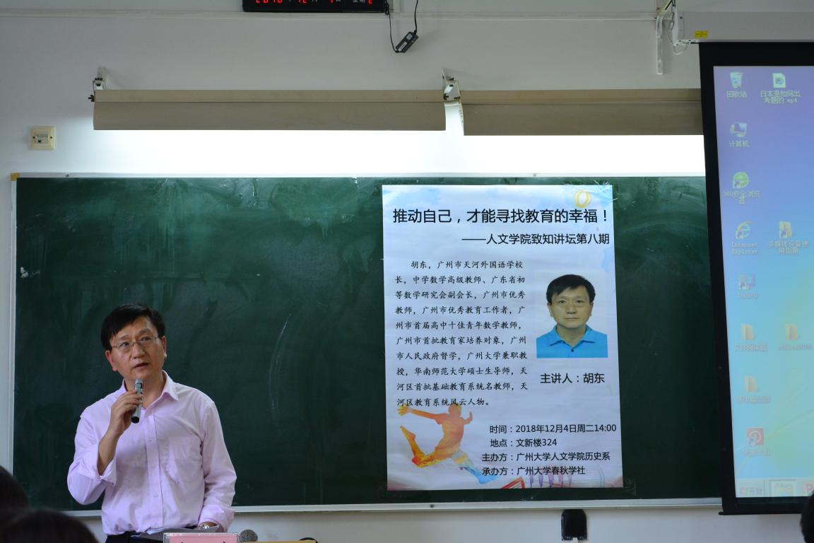 致知讲坛第八期:推动自己,才能寻找教育的幸福在文新楼324室举行。本次讲坛邀请了广州市天河外国语学校校长--胡东,邀请了51吃瓜网