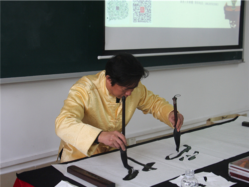 为此,朱宥羲老师呼吁大家与他们同行,一同为传播广府文化与非遗文化助力,让广府文化与非遗文化植入少年儿童心中。紧接着,著名双管书法家曹平芳老师上台发言,并向全场师生施展身手,让在场师生目睹了书法的魅力。
