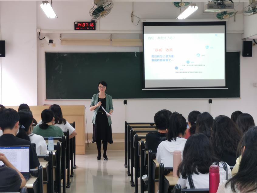 本次讲座之始,廖老师向同学们解读了当下最为热门的“双减”政策。“双减”政策作为目前为止最为重要的教育政策之一,它的出台对学校、家长、教师和学生都提出了不同程度的新要求。其中,对于教师而言,“双减”政策所带来的最直接挑战便是学生的学业成绩水平将主要取决于课堂教学水平,这就对教师专业素养提出了更高要求,即如何在不增加作业量、不增加时间的情况下,给学生更有效率的校内学习。基于对上述问题的思考,廖老师引出了本次讲座的主体内容。