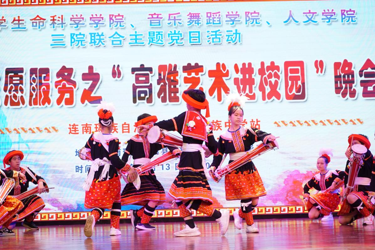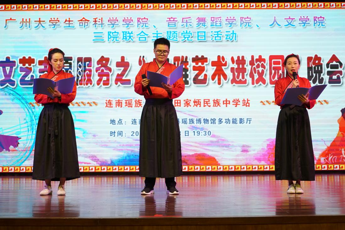 13日晚,文艺志愿服务之“高雅艺术进校园“(连南瑶族自治县田家炳民族中学站)暨“民族团结”晚会在连南瑶族自治县瑶族博物馆影剧院顺利开展,来自两所学校的别具特色的16个节目为在场观众呈现了一场精彩纷呈的表演。我校师生节目《我和我的祖国》、《卜算子·咏梅》、《民乐合奏》、《不忘初心》、《滇南映少》、《天山姑娘》、《最文人,最人文》以及田家炳民族中学《原生态长鼓舞》、《绣歌堂》等节目也收获了大家的一致好评。晚会即是两校风采展示的舞台,更是两校文化交流的重要平台,为两校的进一步交流合作拓展了思路,拓宽了渠道。
