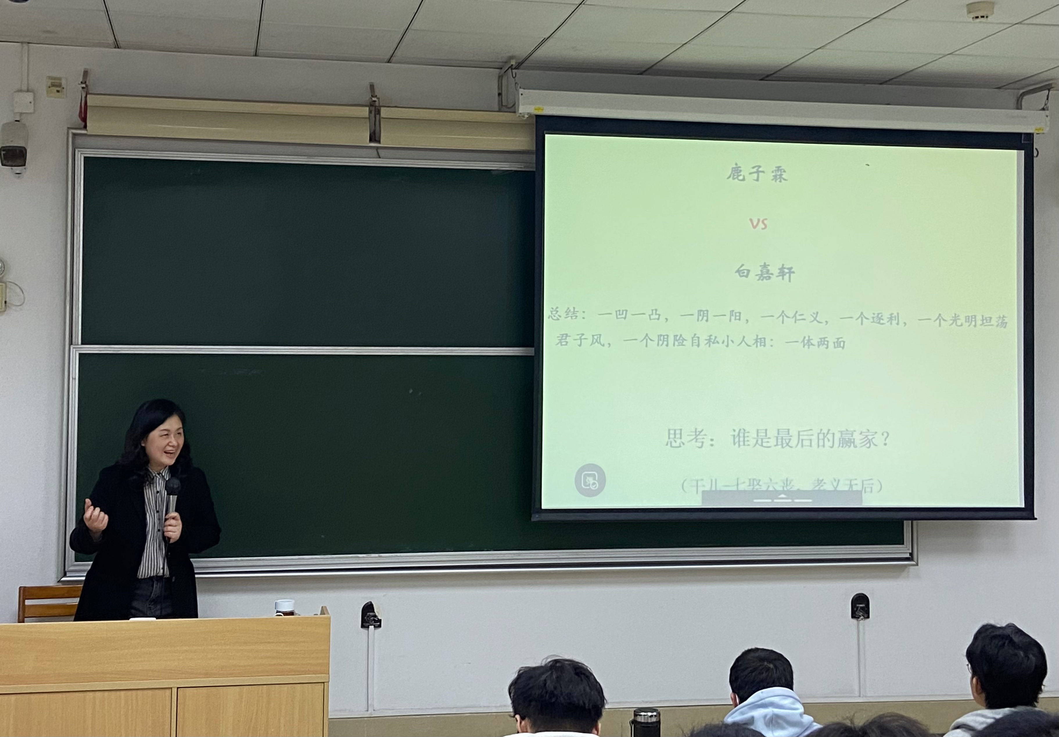 本次公开课的主题是“寻‘鹿’记——《白鹿原》导读”。叶老师通过引导学生概括出当代四大名著《活着》《平凡的世界》《废都》和《白鹿原》,侧面表现出陕西作家陈忠实写作的长篇小说《白鹿原》的创作背景和时代影响。接下来叶老师分别从作家陈忠实、原上那些事、原上那些人、“鹿”在何方这四个方面生动细腻地阐释了《白鹿原》的故事情节、人物形象和文化内涵。叶老师授课风格深入浅出、语言生动、讲解细腻,善于通过具体文本内容和提问的方式,启发学生反思日常生活普遍存在的现象,增强了课堂的互动性和哲思性。